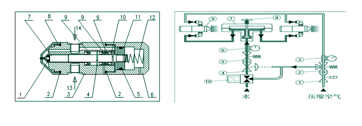 具有自動(dòng)清除水垢和積塵、防止滴水功能的氣動(dòng)針閥如圖1所示,噴嘴霧化裝置由噴嘴基座、前蓋、后蓋、噴嘴閥芯(氣動(dòng)針閥)、活塞以及若干個(gè)密封圈組成,前蓋設(shè)置在噴嘴基座的前端,其上開(kāi)有出水口,后蓋設(shè)置在噴嘴基座的后端,噴嘴閥芯安裝在噴嘴基座的空腔內(nèi),噴嘴閥芯的后端還安裝一活塞,該噴嘴閥芯的后端與后蓋之間還設(shè)置有壓縮彈簧,前端裝有“O”型密封圈;噴嘴基座上還設(shè)置有水路和氣路,水路連通到噴嘴基座的空腔內(nèi),氣路的一路連通到所述噴嘴基座的底部,另一路連通到噴嘴基座的頂部。噴嘴閥芯的前端還設(shè)置一與所述前蓋上的出水口相配的細(xì)針當(dāng)壓縮空氣從進(jìn)氣口14 進(jìn)入噴嘴后,一路從噴嘴前端噴出,同時(shí)推動(dòng)噴嘴內(nèi)的氣動(dòng)活塞帶動(dòng)針閥向后移動(dòng),將出水口打開(kāi)。利用虹吸原理,在水路通道內(nèi)產(chǎn)生真空,將水通過(guò)進(jìn)水口13 吸入噴嘴內(nèi),并從出水口噴出,被空氣霧化。利用壓縮空氣的通斷,可以控制噴嘴閥芯(即氣動(dòng)針閥)的往復(fù)運(yùn)動(dòng),噴嘴閥芯前端與前蓋上的出水口相配的細(xì)針可以將出水口的水垢和積塵迅速的清除掉。當(dāng)壓縮空氣斷開(kāi)或氣壓低于0.2MPa時(shí),噴嘴閥芯在尾部彈簧力的作用下,立即將出水口密封,滴水不流。